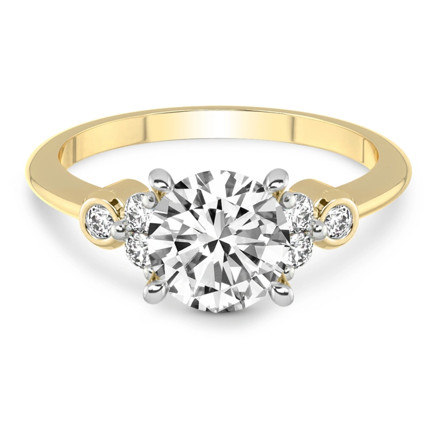 & Free ShippingThe Amore 10kt yellow gold lab diamond ring highlights the solitaire with four prongs and three side stones on either side.