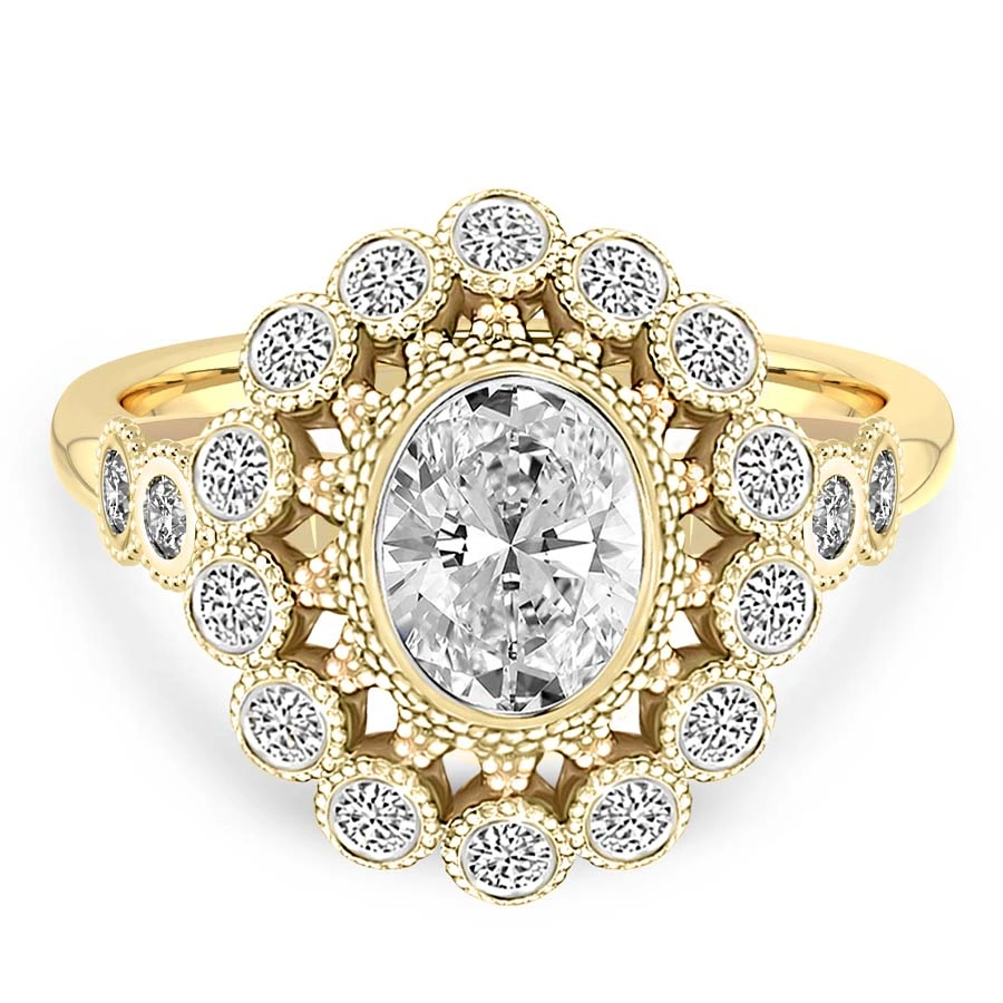 Side smaller accent diamond set in individual migran textured bezels bloom out from the center lab diamond giving it a vintage look. The shank of the ring has two bezel set accent diamond on either side of the ring.