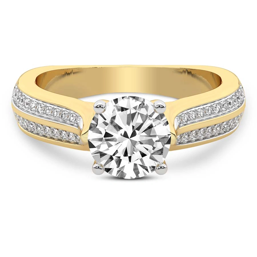 A center solitaire set in a four prong basket has side stones placed at a slight angle on both sides of this lustrous and lovely design. The cathedral shank of this ring is a stunning add-on with a bold high polished pavé wall. Enhance your confidence and take your engagement look to another level with this mesmerizing ring.