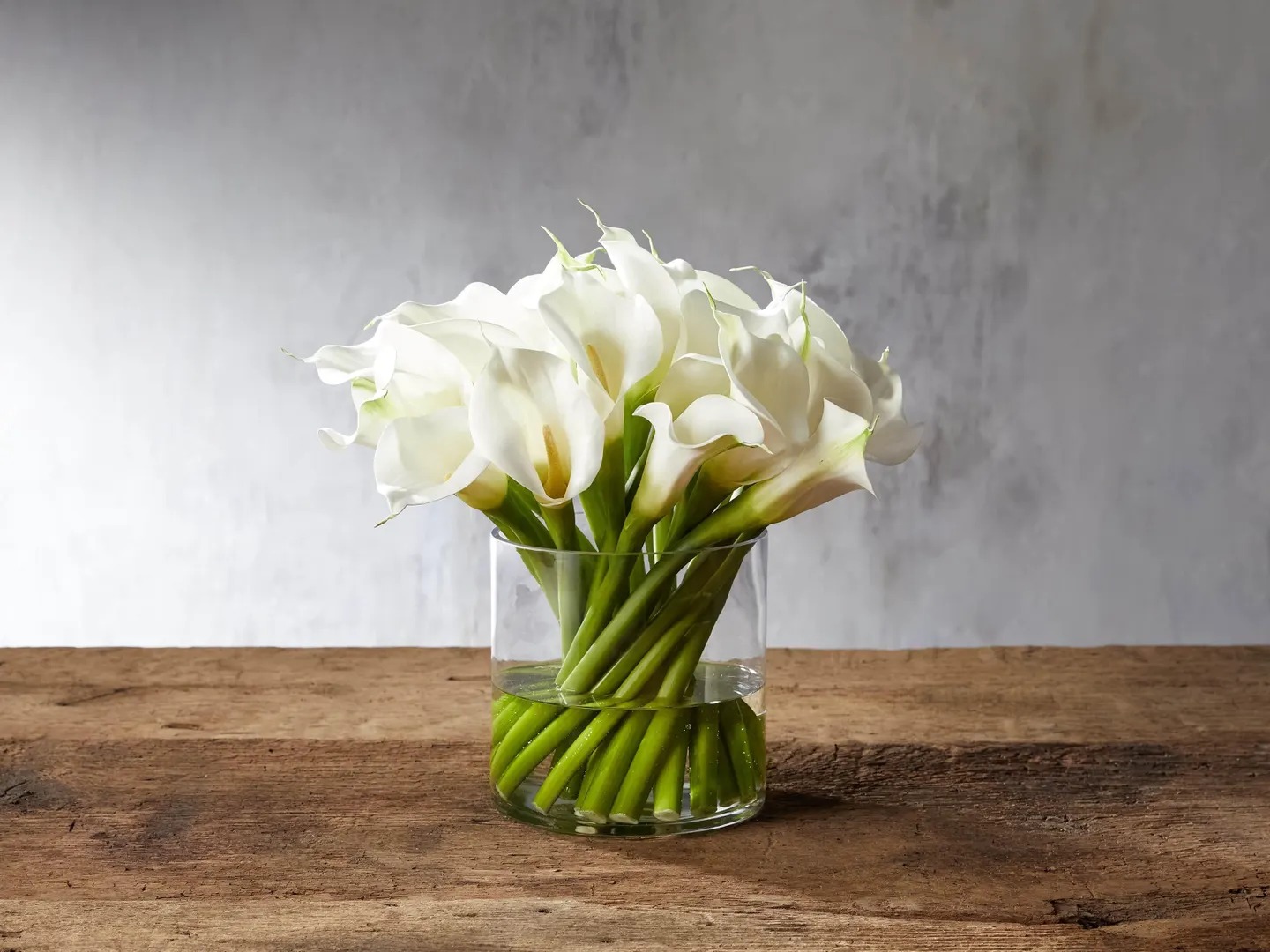 An elegant, simple arrangement of hand-painted faux calla stems suspended in crystal clear artificial water are handcrafted with high-quality materials to achieve a realistic look