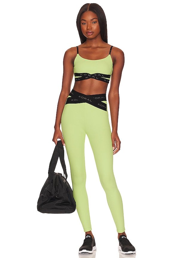 A high-fashion aesthetic is combined with high-performance materials so you can look stylish while working out with Koral’s range of crop tops, leggings, jumpsuits, shorts, and sports bras. These bright green-yellow Herea Leggings have a stunning, flattering look and there is also a matching sports bra available too!